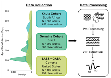 We collected standardized EEG VEPs from 802 infants (ages 57 to 579 days old) from four longitudinal cohorts across three global sites (i.e., Cape Town, South Africa; São Paulo, Brazil; and Boston, USA), resulting in 1374 observations. These sites represent distinct cultural, linguistic (i.e., primarily speaking Xhosa, Brazilian Portuguese, and English, respectively), geographic, and socioeconomic contexts. For example, the socioeconomic diversity can be seen as more than 60% of the caregivers in the South Africa cohort reported an annual household income of less than $3,303 (60,000 ZAR); whereas 10.3% in the Brazil cohort fell under an HHI of $4,763 ($27,600 Brazilian Real) and only 5.4% in the US cohort reported making $50,000 or less. These differences allowed us to test whether developmental trajectories generalize across markedly different settings.