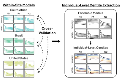 We developed growth curves for the different EEG signal components of this visual response. After extracting VEP waveforms from the EEG data, they can be characterized by the amplitudes (i.e., heights) and latencies (i.e., times from stimulus onset to peak) of the N1, P1, and N2 peaks. Growth curves for each of these parameters were created. Our modeling approach applied GAMLSS5 (generalized additive models of location, scale, and shape), a flexible centile-modeling method that can capture complex nonlinear trajectories and has been used in growth-chart work (see Figure 2). This approach creates flexible centile curves similar to those used in WHO growth standards. However, given the diversity of our three sites, we sought to test whether the developmental patterns we observed were similar across the distinct populations. When we modeled visual neurodevelopment features in two of the sites, we successfully applied the model to the held-out site, suggesting that these developmental trajectories were similar across populations.