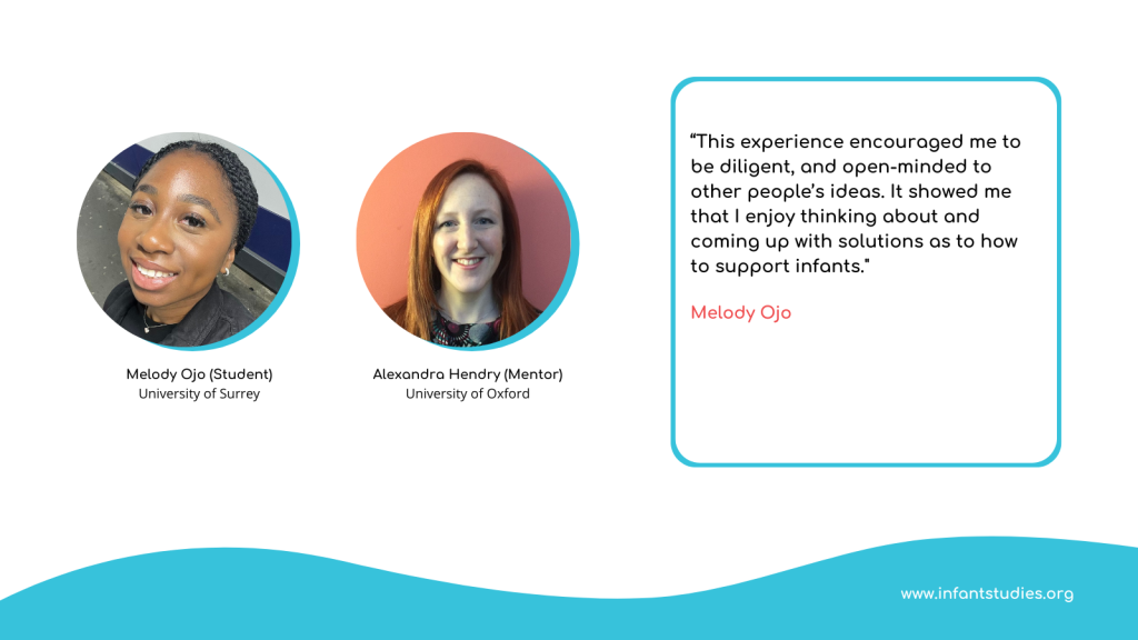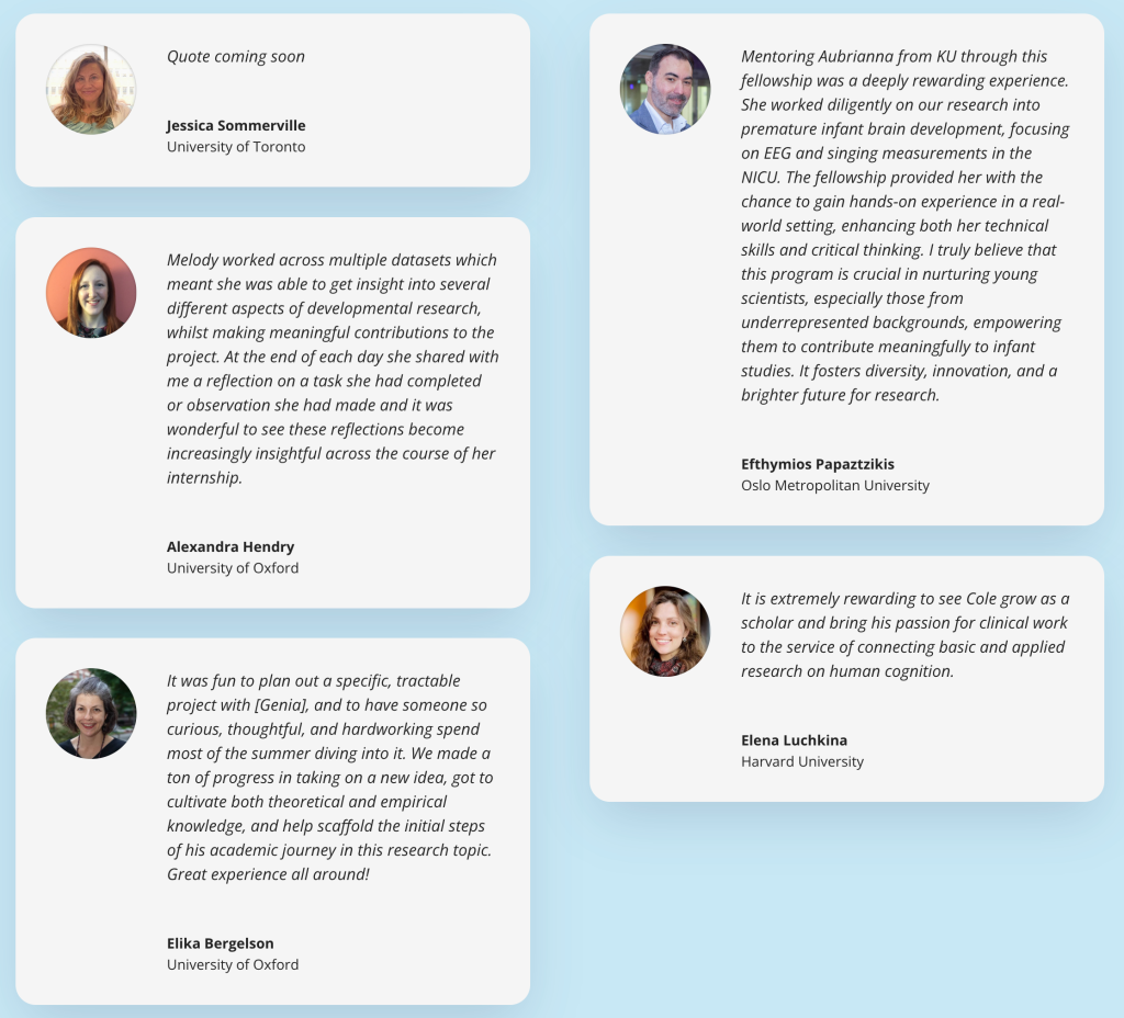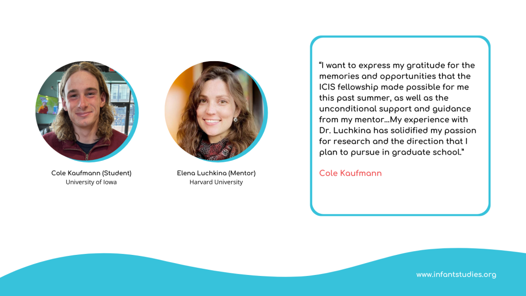 Building on the success of the initial cohort, in the summer of 2022, ICIS paired 6 undergraduate students with mentors. Testimonials from mentors and students show that participants greatly valued their experience. Students highlighted many benefits of the program, including learning about developmental science and gaining a deep appreciation and knowledge of a specific area of infant research. The summer fellowships inspired, educated, and enabled students in a variety of ways.